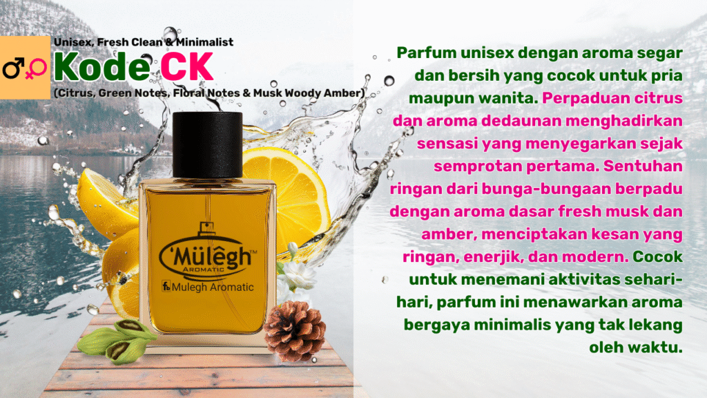Parfum ini punya wangi aromatik citrus dengan basis musky-woody, yang segar tapi tetap tahan lama. Saat kulit mulai hangat & sedikit berkeringat, kombinasi citrus & rempah-rempah ringan menjadi lebih bersih & energik, tidak berubah jadi aroma “kecut”. Musk & kayu pada lapisan bawah membuat aroma tetap terjaga bahkan saat tubuh sedang aktif.