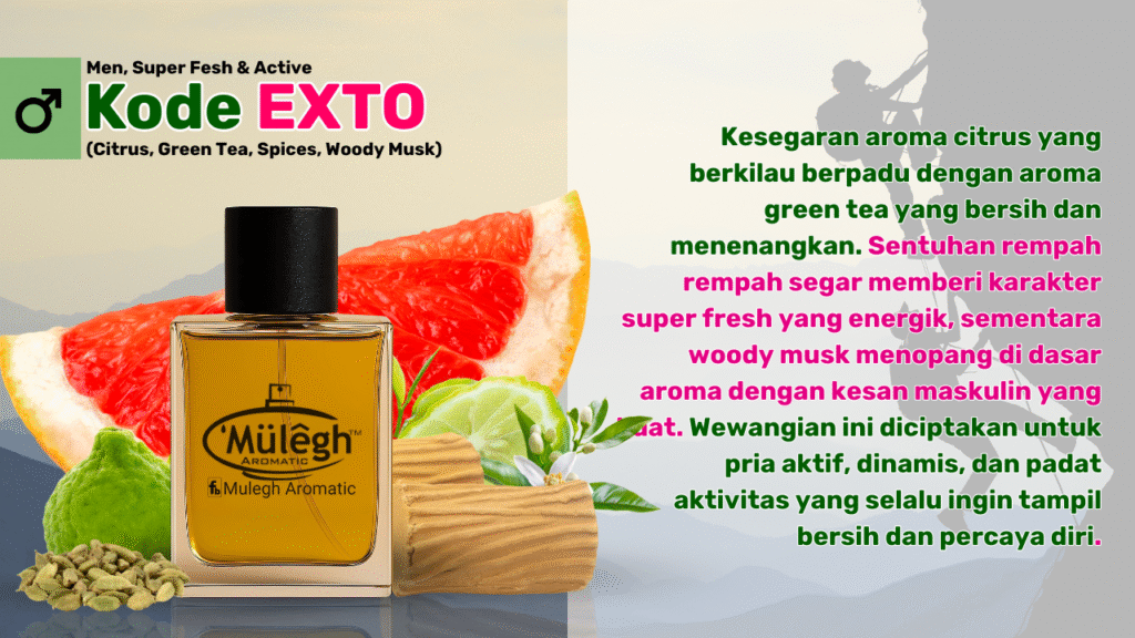 Exto memiliki komposisi yang unik ketika bercampur dengan panas & sedikit keringat. Aromanya jadi lebih dalam, musky & menggoda. Lada & citrus-nya juga jadi lebih aktif & menyebar luas saat suhu naik.
